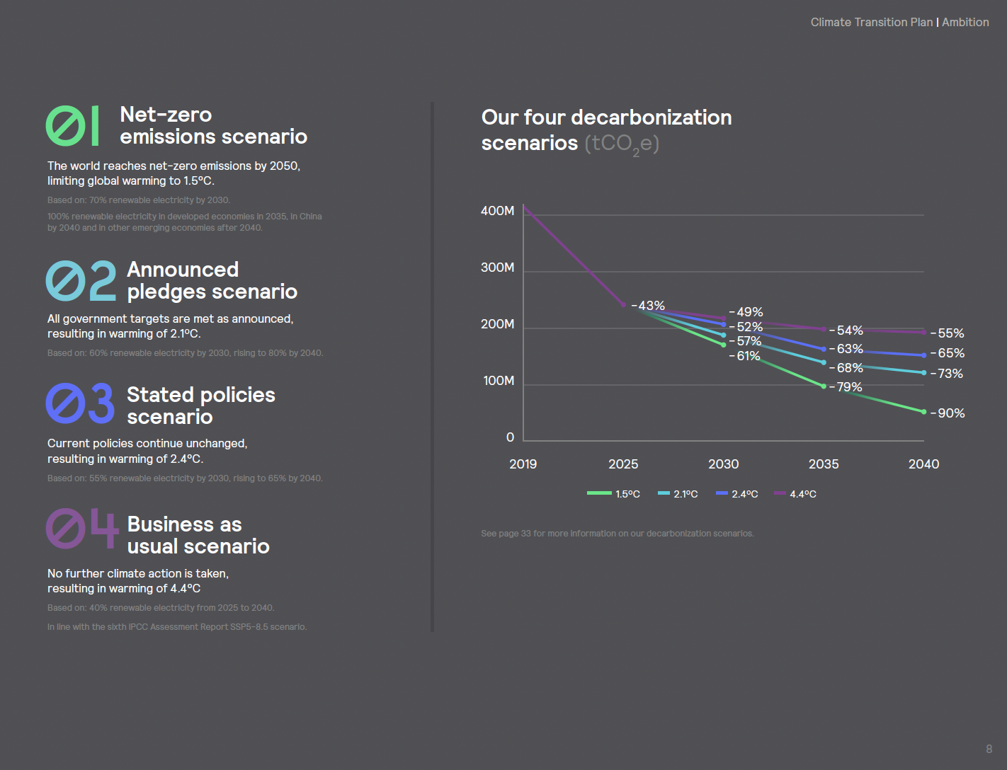The climate transition plan was structured around the We Mean Business Coalition’s four key themes: ambition, action, advocacy, and accountability. This allowed Signify to clearly explain their targets, strategies, and progress.