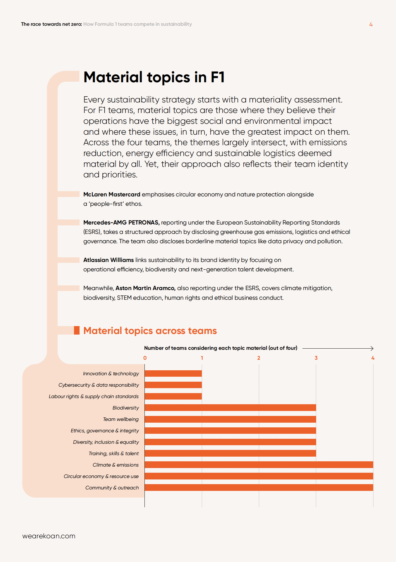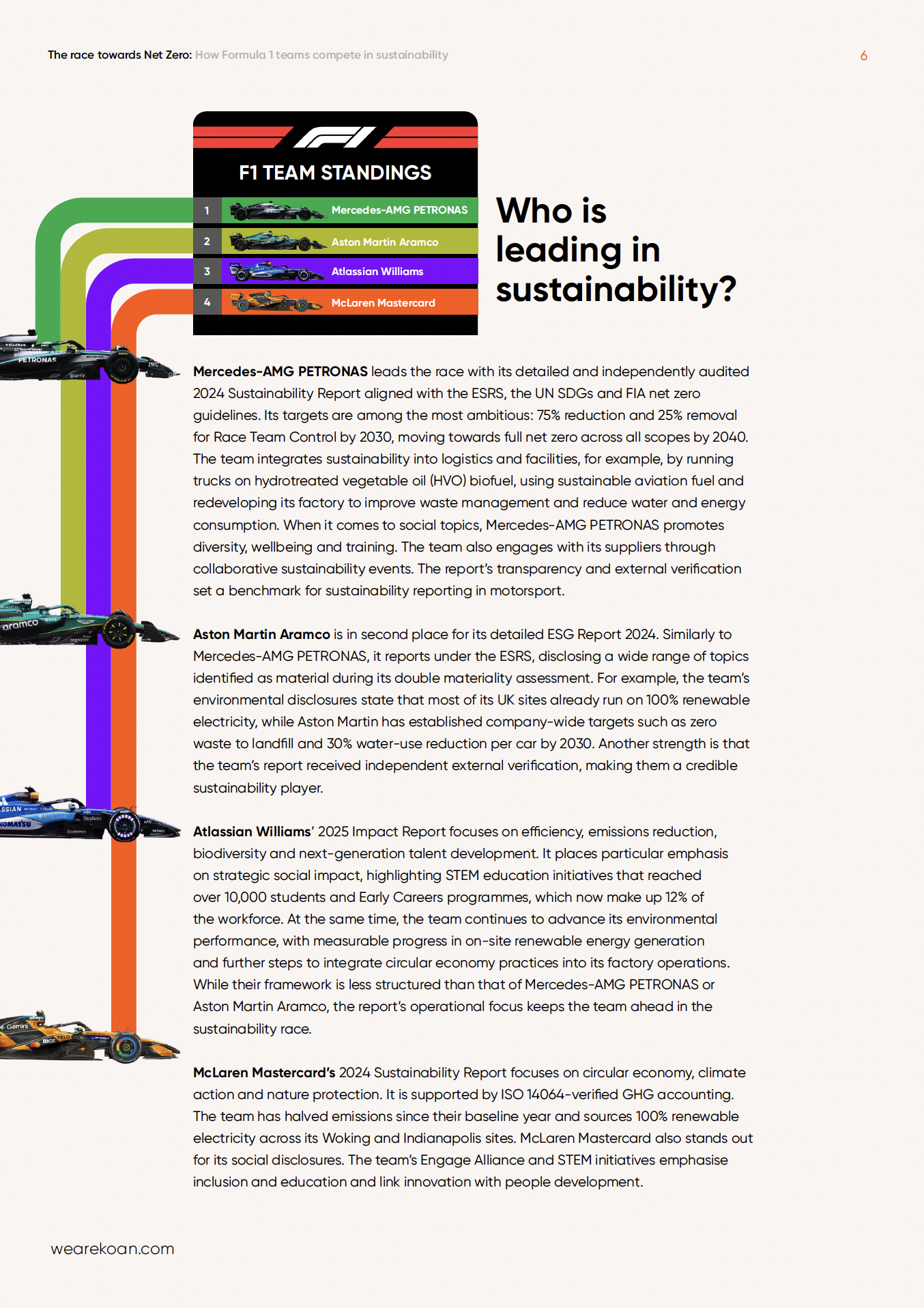 We reviewed those reports from McLaren Mastercard, Mercedes-AMG PETRONAS, Atlassian Williams and Aston Martin Aramco, and ranked them across environmental performance, social impact and reporting credibility.