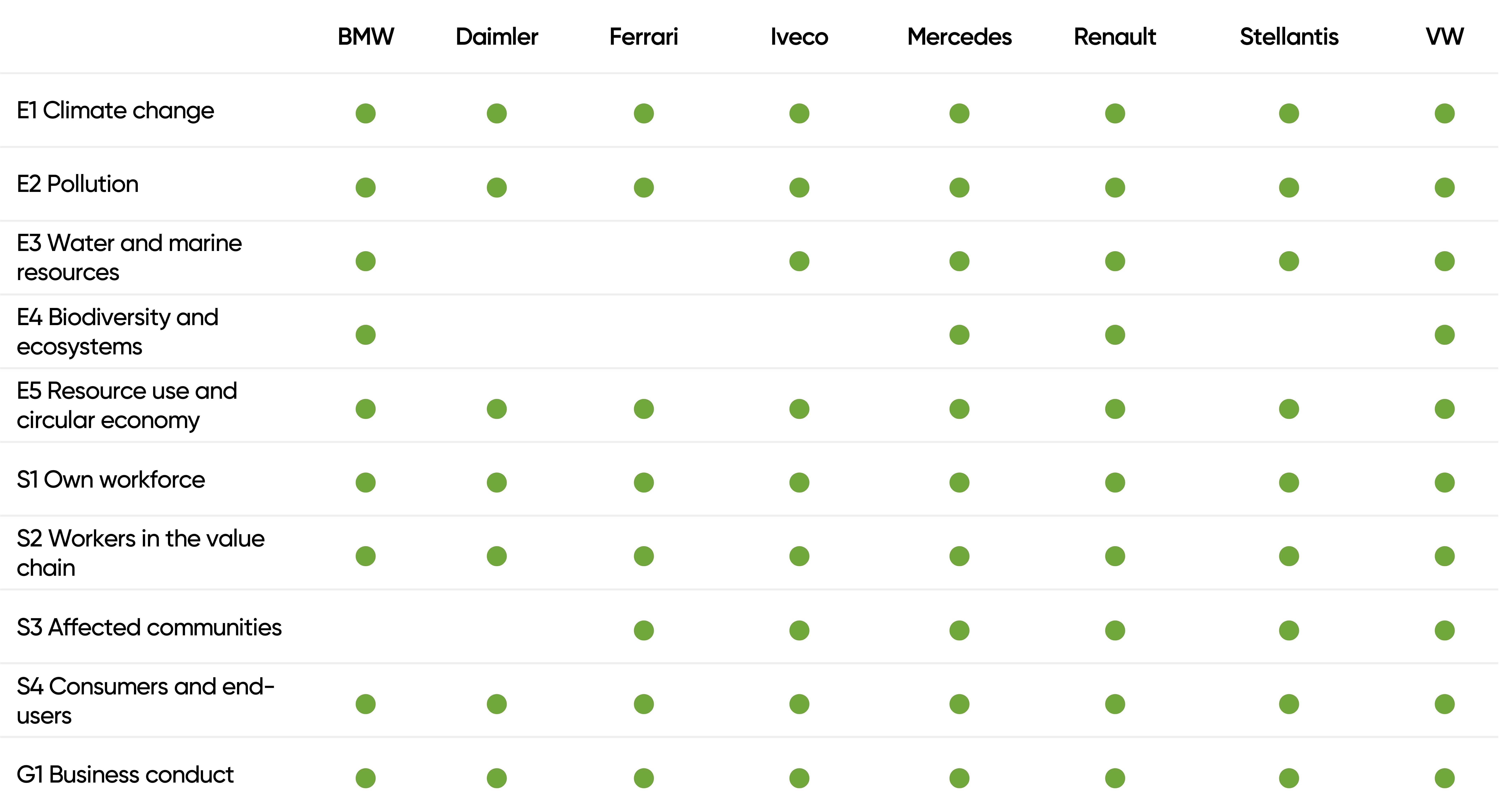 Given the broad similarity of automotive business models – turning raw materials into vehicles, mostly with internal combustion engines – the companies analysed generally identify and report on similar sustainability issues. Seven of the ten main topics listed in ESRS 1 are deemed material by every company (see table).